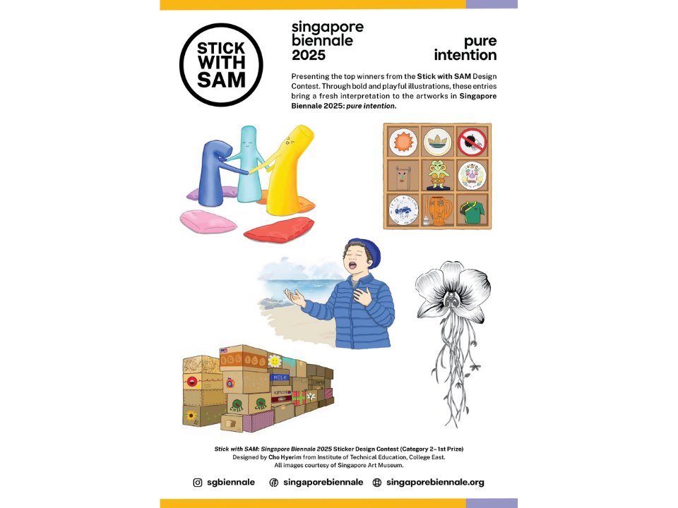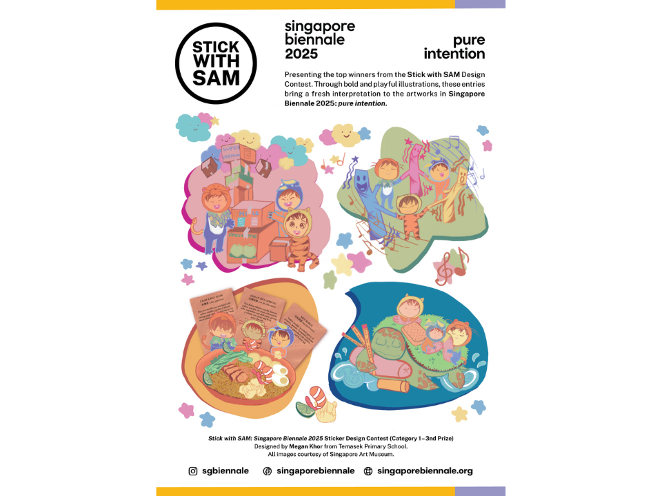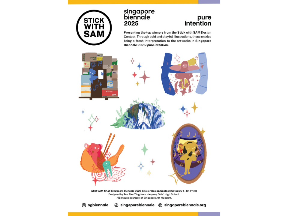 The Stick with SAM Design Competition is back for a special edition celebrating the Singapore Biennale 2025: pure intention. We are excited to invite youth and students aged 10 – 25 to showcase their creativity through sticker designs inspired by artworks from the Singapore Biennale!