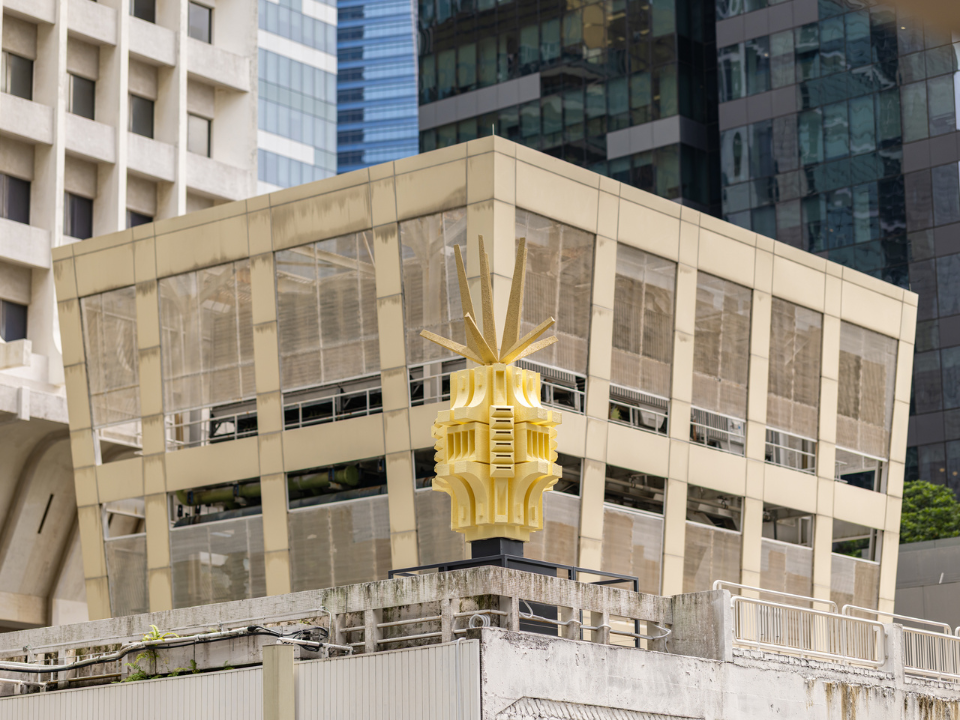 Situated at Shenton House—soon to be demolished and the last of Shenton Way’s “three sisters”—Sweet Water responds to its iconic brutalist design. The series of sculptures is inspired by the building’s grid-like form and mosaic crown, playfully translating them into a pineapple. Placed at the edge of the rooftop carpark and along street-level planters, their texture mimics the brutalist aesthetic, paying homage to an architectural style prevalent in Singapore in the 1970s and 1980s. The work is also a sculptural tribute to the pineapple, an enduring symbol of prosperity in Singapore. Pineapples in the CBD are not a new phenomenon: an 1861 record notes that slices of the fruit were sold at Raffles Place for one cent. Titled after a 1970s headline celebrating a surprising flow of fresh water during early Shenton Way redevelopment, Sweet Water celebrates the enduring symbols and the memory of an ever-changing cityscape.
